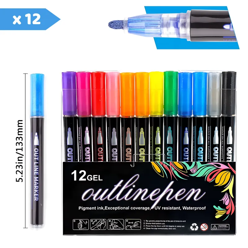 12pcs Coloured Outline Marker Metallic Gel Pen Set