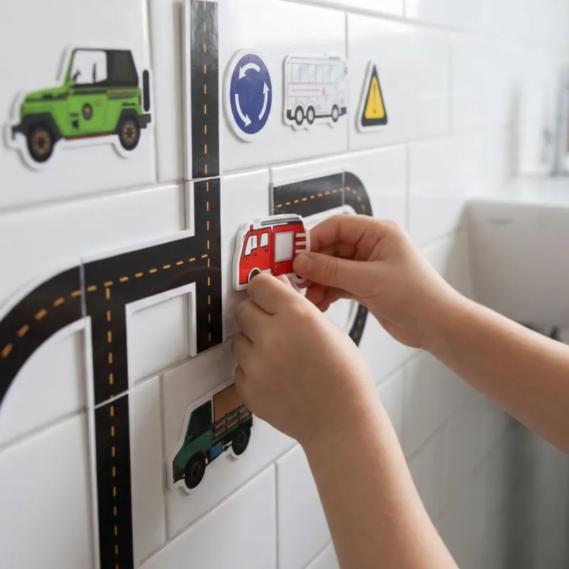 Make every wash a playful adventure with exciting bathroom tile stickers. Creative vehicles, roads and signs stick easily to tiles, sparking endless stories. Children enjoy building their own city scene while you relax, knowing bath time is mess-free.