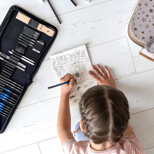 I always keep this art set in my bag for after-school lessons. There are so many pencils and tools to try out new ideas.
