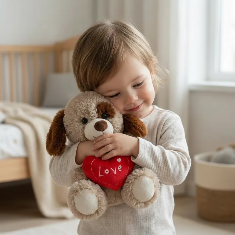 Snuggly friend with bright colors! My little sister carries it everywhere. It’s gentle and squishy, and she loves showing off the red heart.